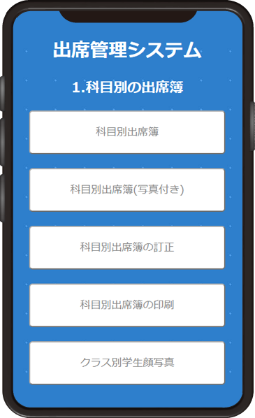 メニュー画面です。 ここから行いたい機能を選びます。 機能は学校さまによって必要なものを追加・削除できます。 こちらの学校さまでは、